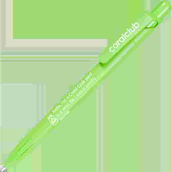 Przyciskany długopis wykonany z materiału PET-RECYCLED z nadrukiem "Hello, I'm a Coral Club pen! In a past life I was a plastic can".